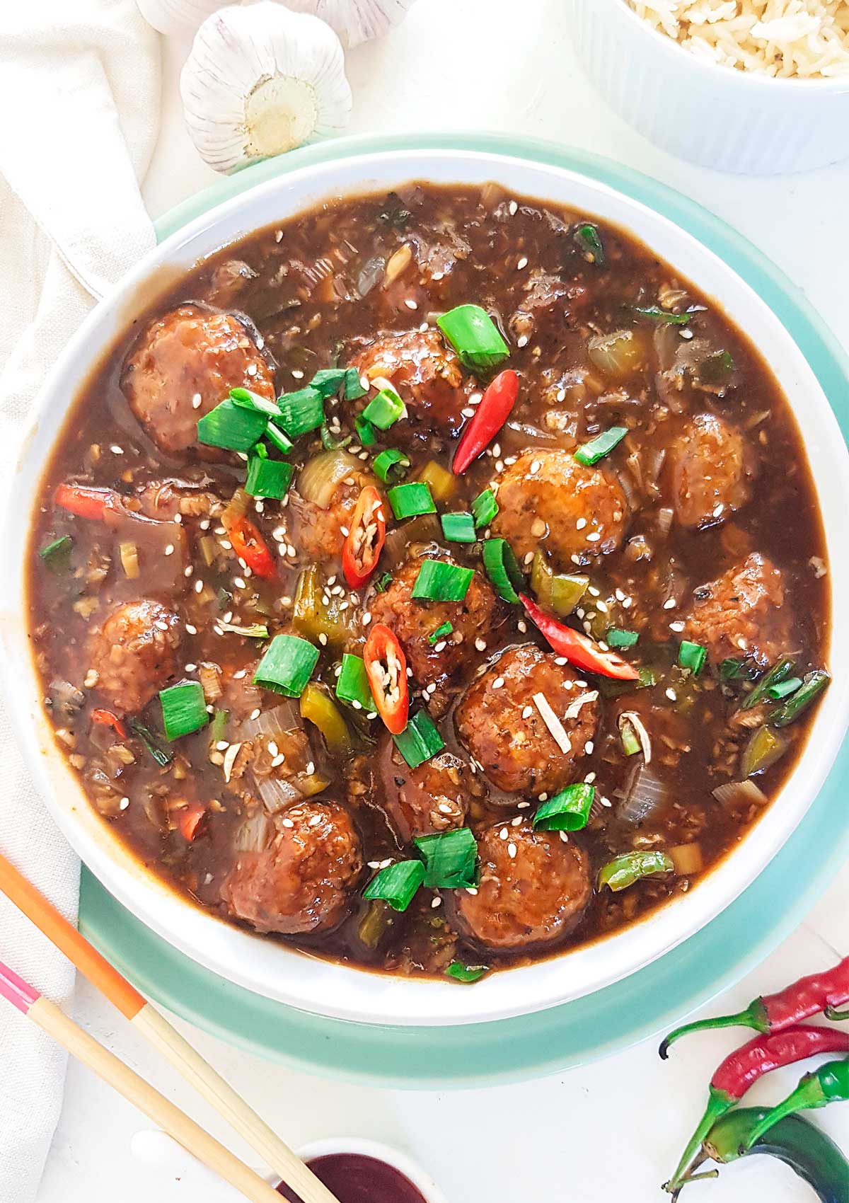 - Turn off the heat and add vegetable balls just before serving. Garnish with some more spring onions, red chilies and sesame seeds.