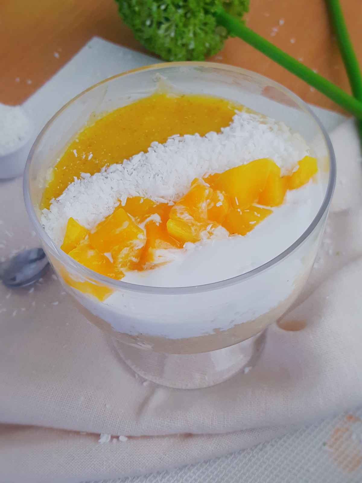 Semolina pudding served in a glass jar topped with coconut cream, mango slices and coconut shreds.