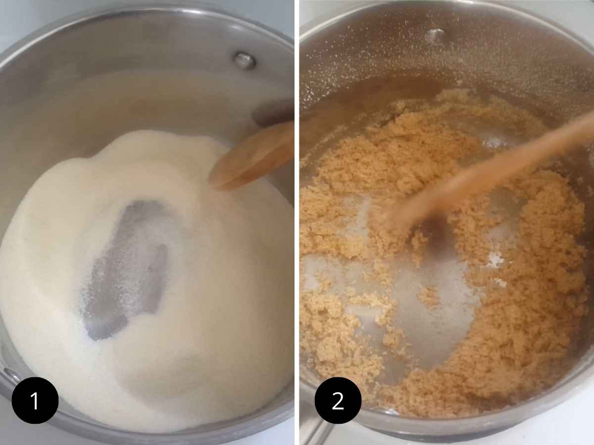 • Heat a non-stick pan or a heavy-bottomed saucepan over a low flame. Add the semolina and begin roasting it for 3 to 4 minutes, stirring continuously. The gentle heat ensures even toasting and prevents burning.